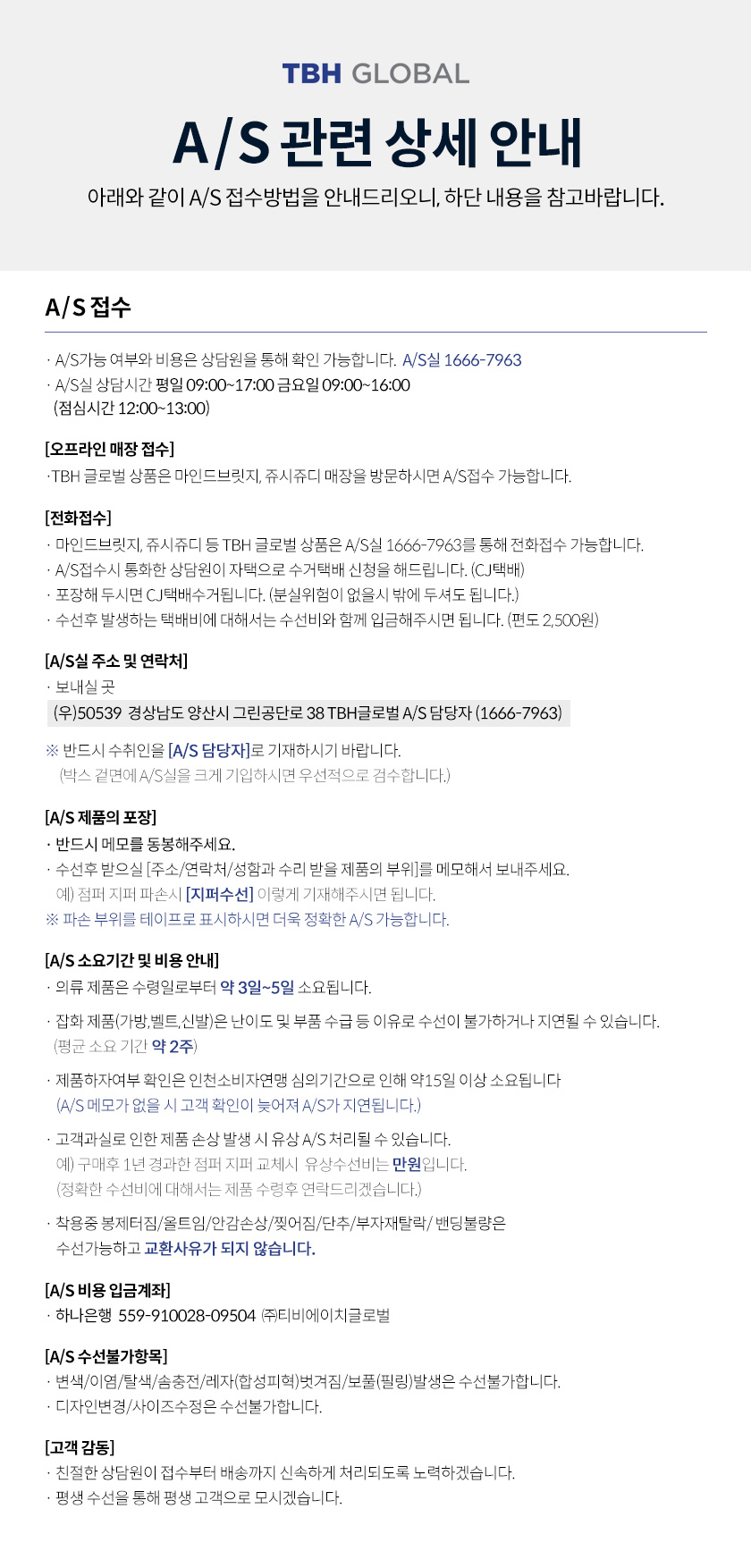 고객센터FAQ공지사항1:1 문의하기매장안내공지사항TBH SHOP 고객님들께 안내드립니다.19TBH GLOBAL A/S 관련 상세 안내18마인드브릿지 디지털보증서 발급 안내17개인정보처리방침 개정 안내(25.07.24)TBHSHOP 을 이용해주시는 고객님께 진심으로 감사드립니다.개인정보처리방침이 변경되어 개정된 내용을 안내드리오니, 이용에 참고하여 주시기 바랍니다. 1. 변경 주요 내용 [제 9조 개인정보의 위탁처리 ] 위탁업체가 추가 되었습니다. 2. 변경 일정 개정 공지일 : 2025년 07월 24일개정 시행일 : 2025년 08월 01일 약관 확인을 부탁드립니다. 약관바로보기 늘 감사한 TBH SHOP 고객님, 행복한 하루 보내세요!16[공지] 멤버십 등급 개편 안내14[공지] 멤버십 등급 갱신일 변경 안내TBH SHOP을 이용해 주시는 고객님께 깊이 감사드립니다. 2024년 3월부터 멤버십 등급 갱신일자가 다음과 같이 변경됩니다. ※ 갱신일 : 매월 3일 → 매월 8일 앞으로도 좋은 서비스를 제공하기 위해 최선을 다하겠습니다. 감사합니다.1234