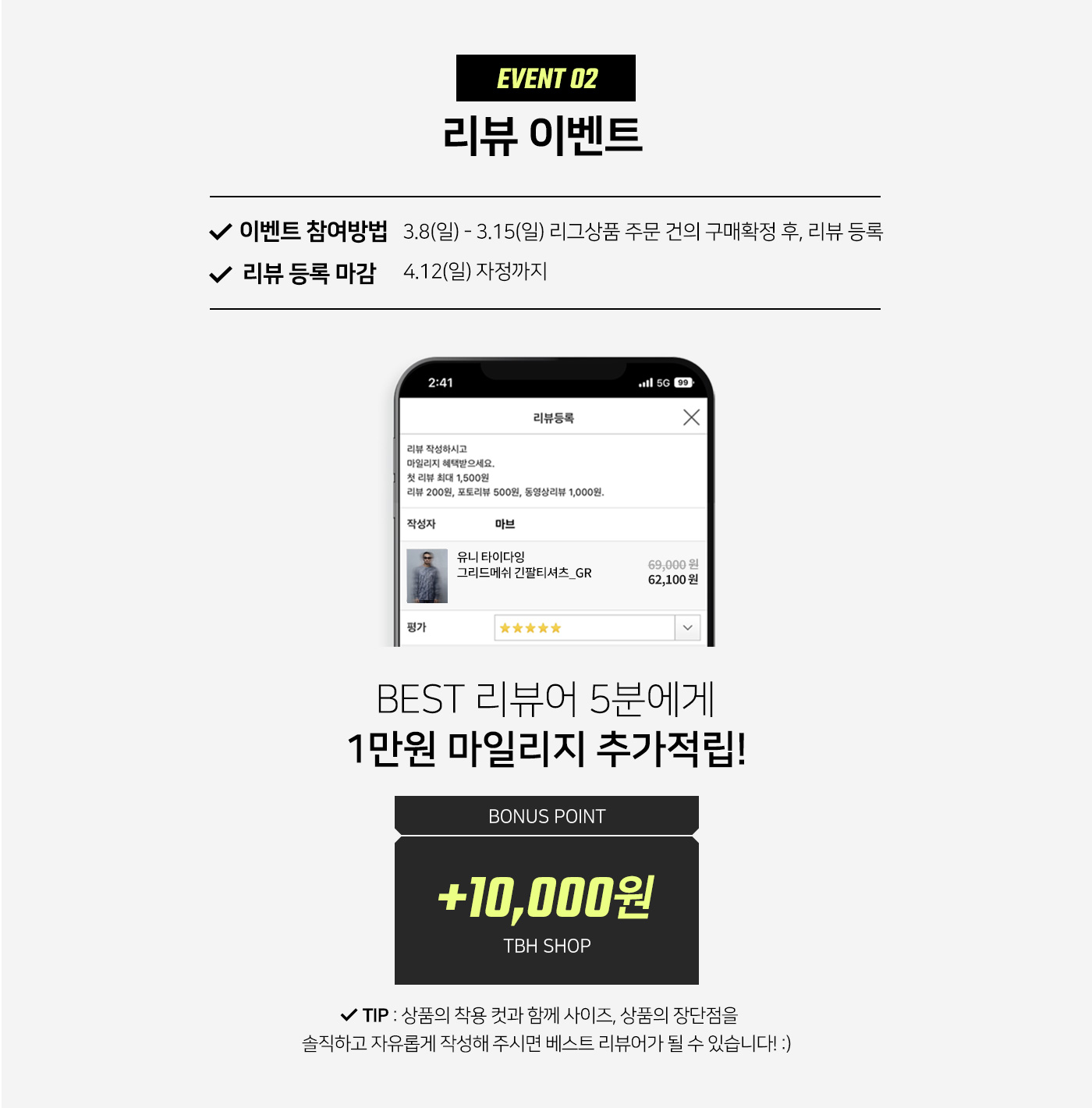 • - 이벤트 당첨자는 4/15(수) 베스트리뷰 발표와 함께 마일리지 1만원 일괄 적립 후 개별 문자로 안내됩니다.